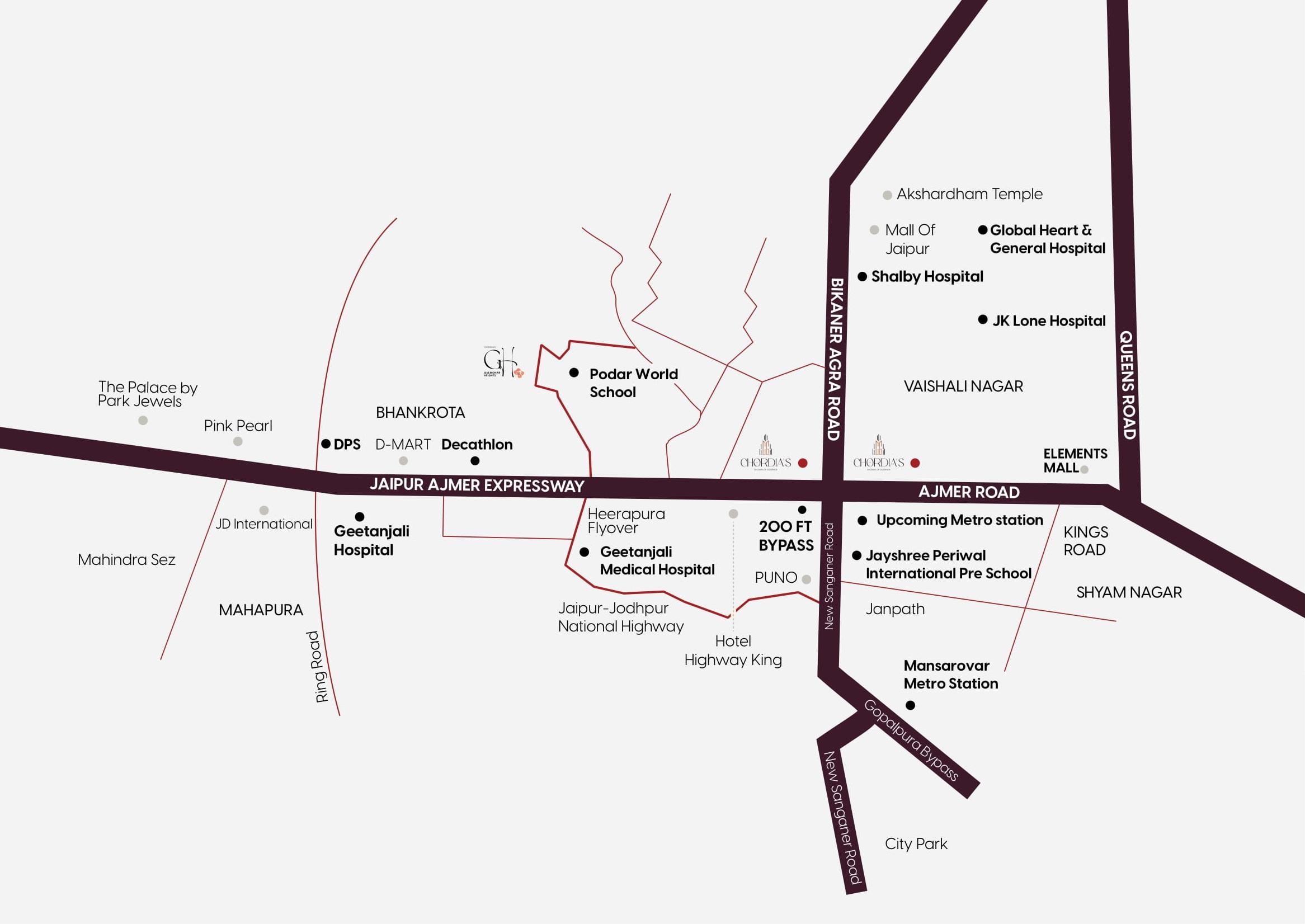 Welcome to Gulmohar heights: Introducing Gulmohar Heights, a new dimension in the Chordia Group's portfolio that embodies the concept of 'Dream Living' amidst Jaipur's premier location, just off Jaipur Ajmer highway. This luxurious residential haven combines contemporary amenities with exceptional high construction standards, offering an exclusive lifestyle with vibrant surroundings and tranquil, scenic greens. Each home at Gulmohar Heights boasts a private garden or an expansive terrace, ensuring unobstructed views with wide open spaces.